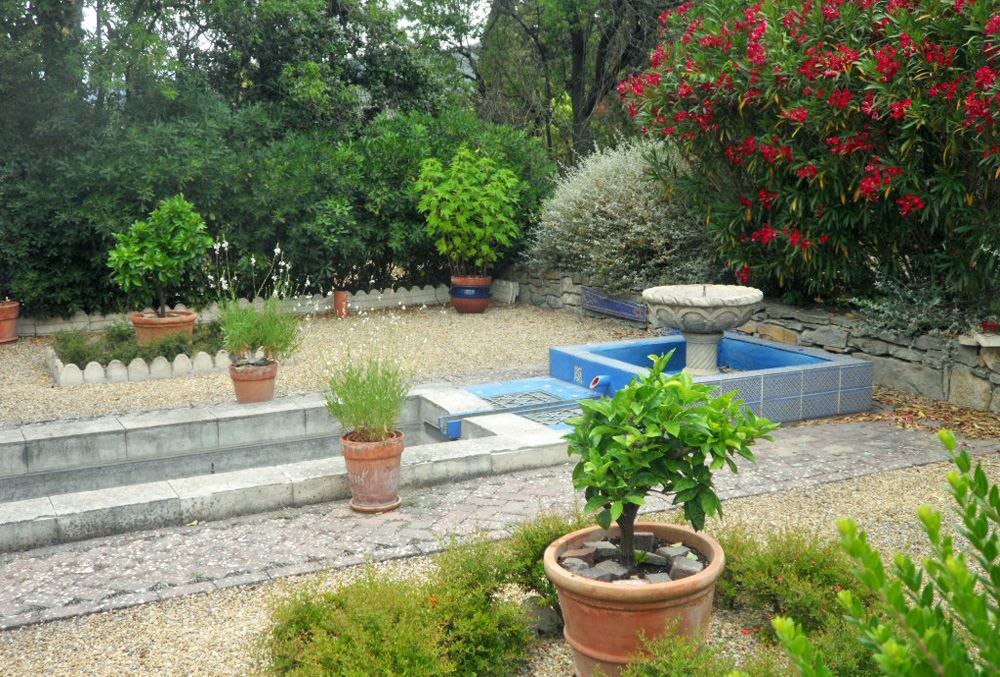 Sur le côté gauche de la pergola, une chambre est structurée comme un jardin mauresque avec un bassin étroit et rectangulaire habillé de beaux carreaux colorés. Quoi de mieux pour nous préparer à la présentation de Liz sur les jardins persans. En contraste, de l’autre côté de la pergola, les pieds de vigne anciens ont été conservés.
