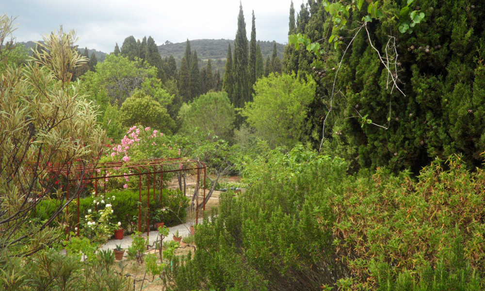A large garden room and a pergola complete the picture on an upper level. The pergola is surrounded by several species, including various grasses. From this vantage point there is a wonderful view of the adjacent garrigue.