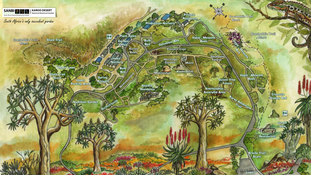 À 120 km au nord-est du Cap, dans un cadre spectaculaire près de la ville de Worcester, se trouve le jardin botanique national du désert du Karoo. Il comprend 154 hectares de végétation semi-désertique, dont 11 sont cultivés, le reste étant naturel à flanc de montagne avec des affleurements rocheux, couverts d’arbustes et de plantes succulentes.