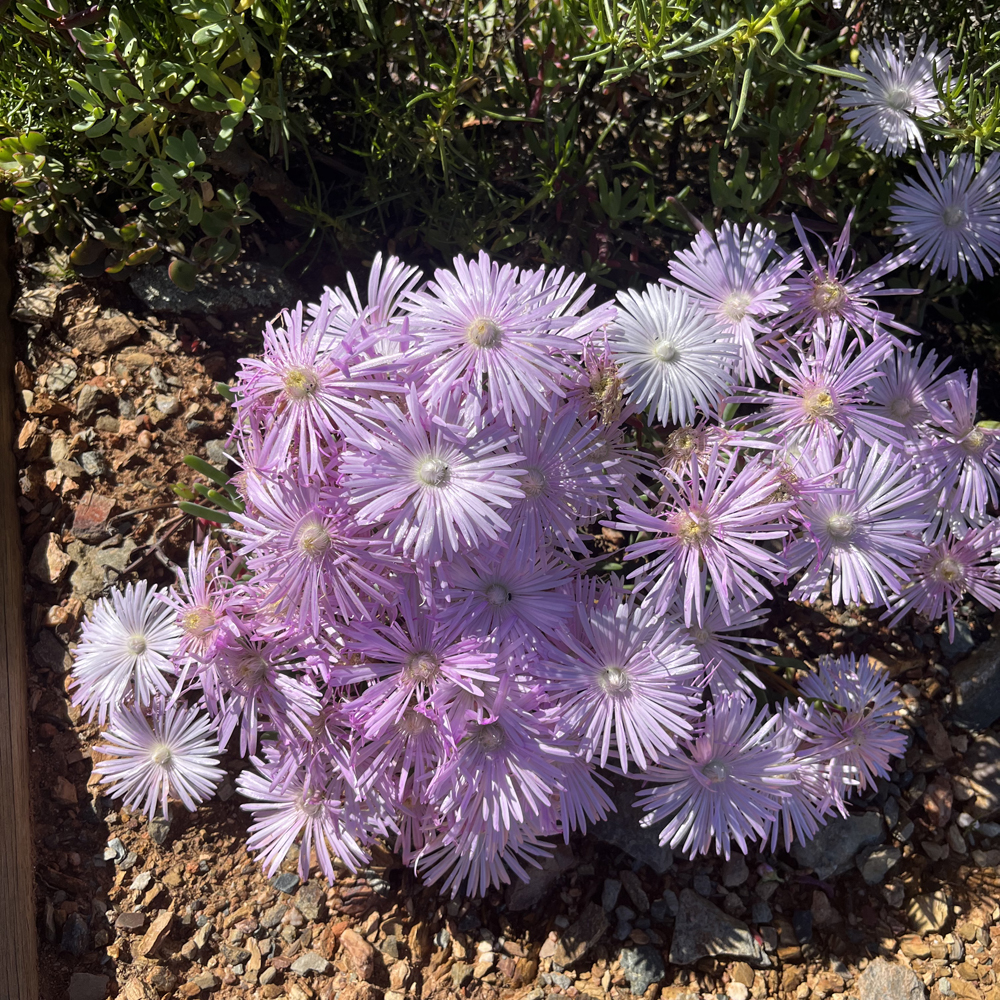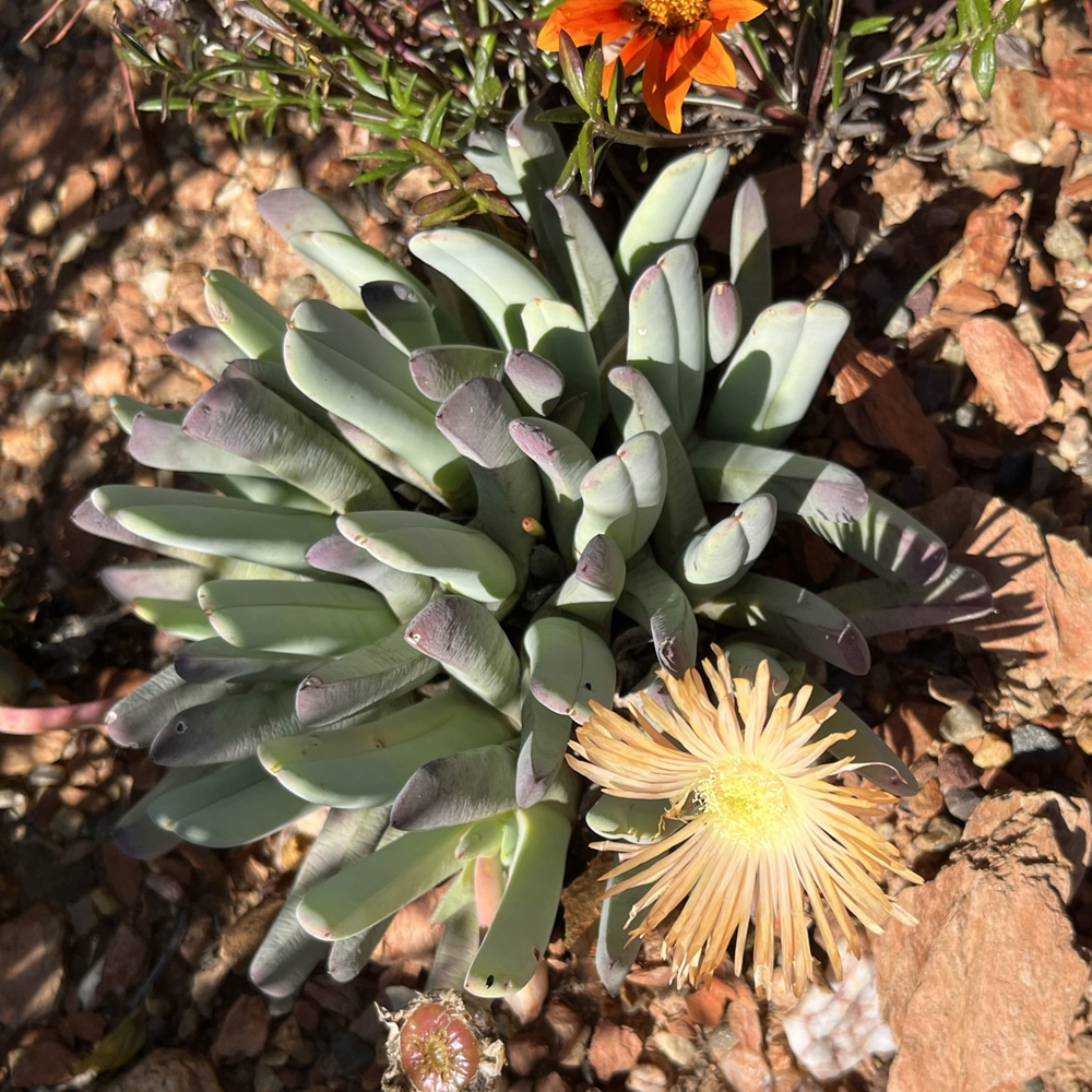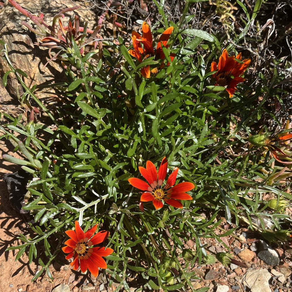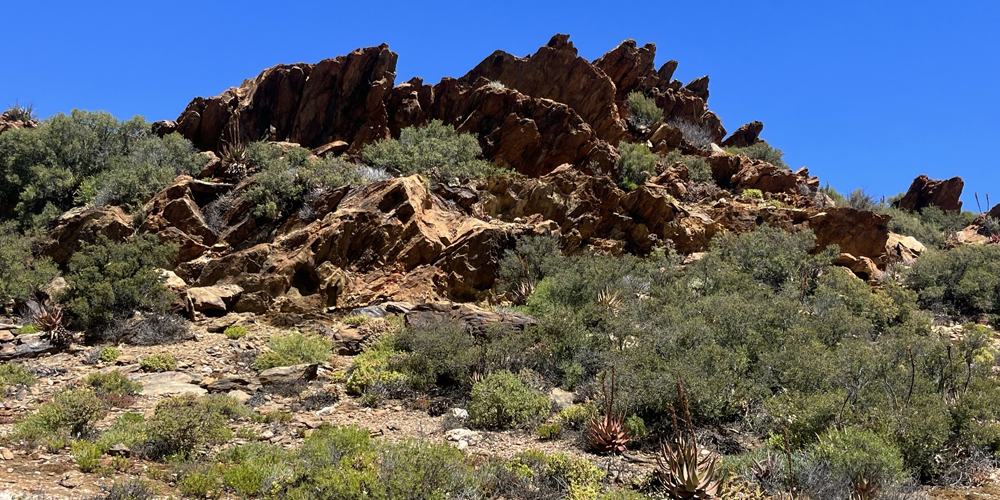 Tandis que ces plantations de mésembryanthèmes nous accompagnaient, au fur et à mesure que nous montions plus haut sur le « sentier des schistes », du nom des schistes de Malmesbury qui caractérisent le paysage, poussaient dans leur habitat naturel des plantes de la famille des Mesembryanthemaceae, à côté d’autres plantes aux fleurs de couleurs vives comme les gazanias.