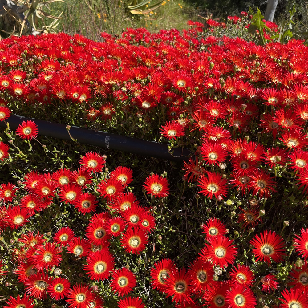 Nous avons eu beaucoup de chance d’y être emmenés par deux locaux bien informés, Leon Kluge, paysagiste, planteur et écrivain, et Tristan Woudberg, artiste et botaniste. En arrivant d’abord dans le jardin « développé », les couleurs fluos des mésembryanthèmes sont surprenantes, surtout pour un œil européen. Des monticules de fleurs rose vif, rouges et orange tapissent le sol.