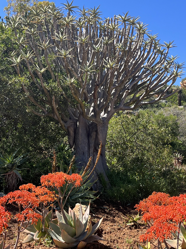 De retour au jardin cultivé, Léon et Tristan nous ont présenté de nombreuses plantes nouvelles pour nous, dont certaines portaient des noms locaux intrigants en raison des utilisations traditionnelles de la plante. La « Bougie du bushman » (Monsonia spinosa) a développé des épines pour la protéger contre la consommation et ses tiges cireuses peuvent être utilisées comme allume-feu de brousse. Les tiges évidées de l’aloès en arbre, Aloidendron dichotomum, ou arbre à carquois, étaient utilisées pour fabriquer des carquois afin de ranger les flèches. Pour une raison évidente, Sansevieria cylindrica, membre de la famille des Asparagacées, tire son nom local de cure-dent d’éléphant.