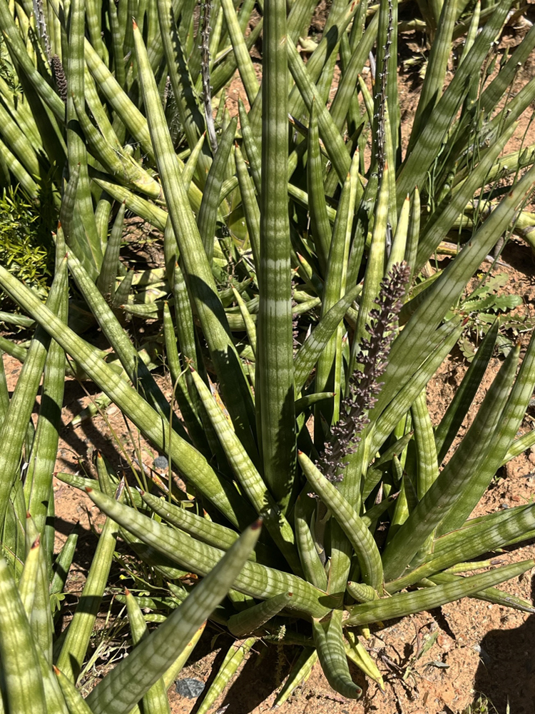 Returning to the cultivated garden, Leon and Tristan introduced us to many plants that were new to us, some of which had intriguing local names due to the traditional uses of the plant. ‘Bushman’s candle’ (Monsonia spinosa) has developed thorns to protect it from being eaten and its waxy stems can be used as a bush firelighter. The hollowed-out stems of the tree aloe, Aloidendron dichotomum, or quiver tree, were used to make quivers to hold arrows. It was clear why Sansevieria cylindrica, a member of the Asparagaceae family, got its local name of elephant’s toothpick.