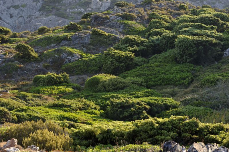 At Cape Creus, junipers, Phillyrea angustifolia, and Pistacia lentiscus combine to form a green-tinted landscape, sculpted by sea spray.