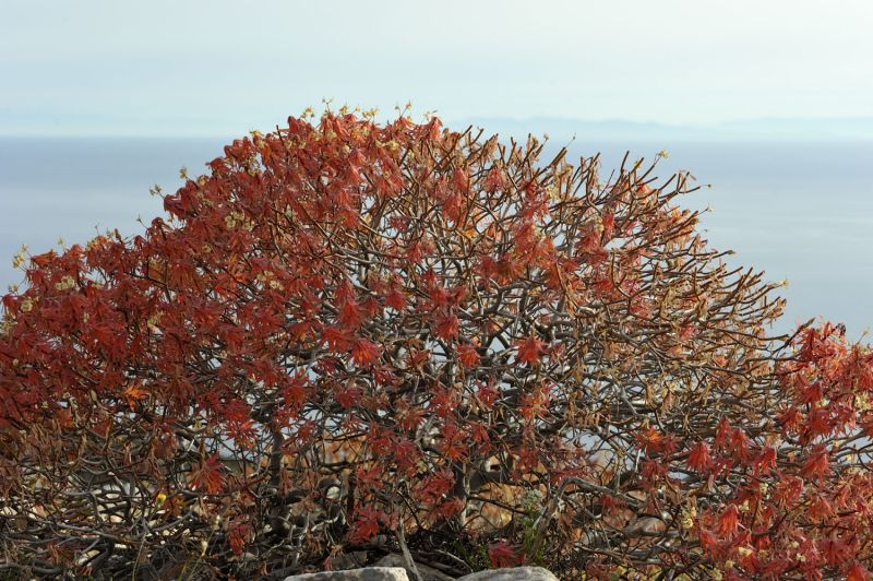 Centaurea spinosa and Euphorbia dendroides adopt rounded forms to optimise photosynthesis whilst limiting exposure to wind and drought. These forms give the garrigue landscape rhythm and movement. However garrigue plants are not shaped just by wind, sea spray or survival strategies. Phillyrea angustifolia, for example, is chewed into artistic shapes by herds of voracious goats. It may not however be necessary to introduce a goat into our gardens!