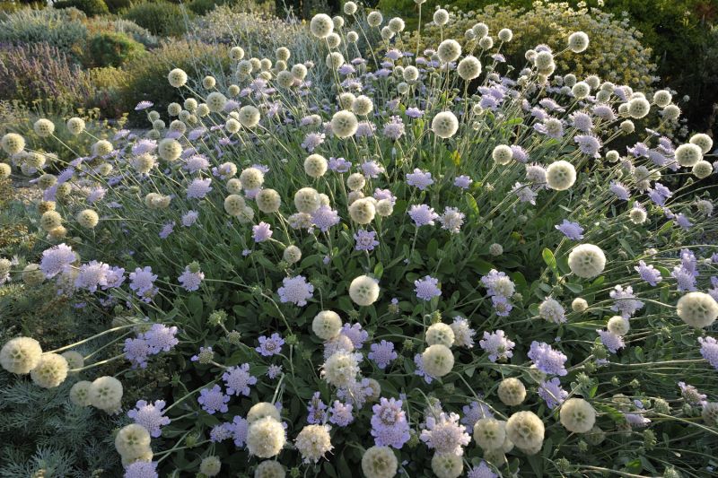 The grey foliage of Euphorbia rigida is adorned with pink and purple highlights from the onset of cold weather. One can also choose plants such as Lomelosia minoana which are covered, after flowering, with decorative dry seed heads. Another example is Cistus monspeliensis with its orange coloured dry seed heads. These are the key elements of a new garden style which also includes the use of grasses, a great asset in a garrigue garden.