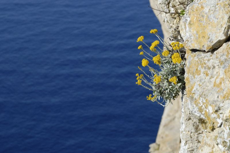 Les plantes de garrigue s’adaptent à des conditions très difficiles et très particulières. Helichrysum orientale est heureux dans une paroi calcaire où la terre semble être absente.