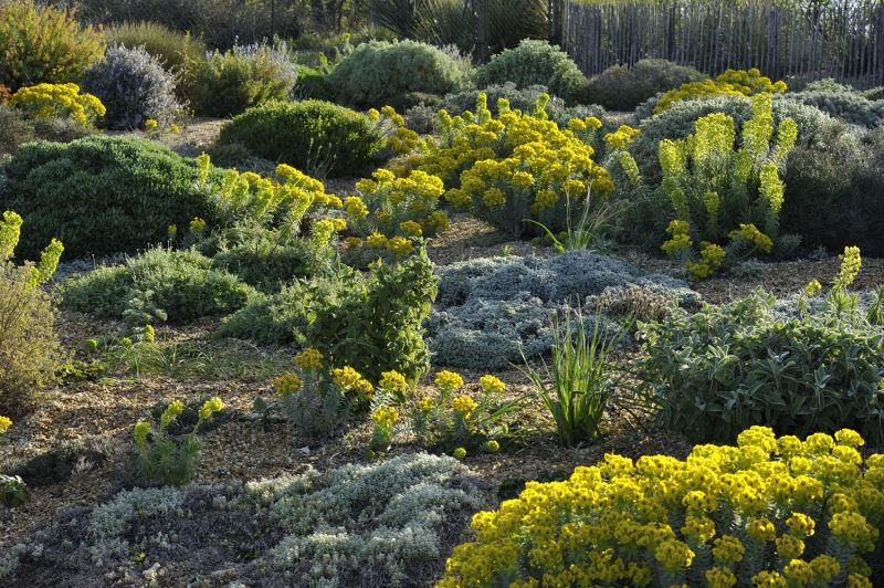 Le feuillage gris d’Euphorbia rigida se pare de reflets roses et violets dès les premiers froids. On peut également sélectionner des plantes qui après leur floraison sont couvertes d’inflorescences sèches décoratives comme par exemple Lomelosia minoana ou encore, Cistus monspeliensis aux inflorescences sèches orangées. Ce sont les éléments moteurs d’un modèle de jardin nouveau comme les graminées qui sont également un atout dans un jardin de garrigue.