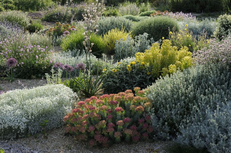 Some plants have developed effective strategies to help them compete with others, for example, Helichrysum orientale is able to grow in a challenging environment, or using allelopathy, ie disseminating chemical compounds which will inhibit the germination of other plants. Tanacetum densum is a very good example of an alternative to weeding. The garrigue garden is one in which there is no need for water or pesticides.