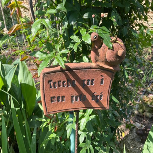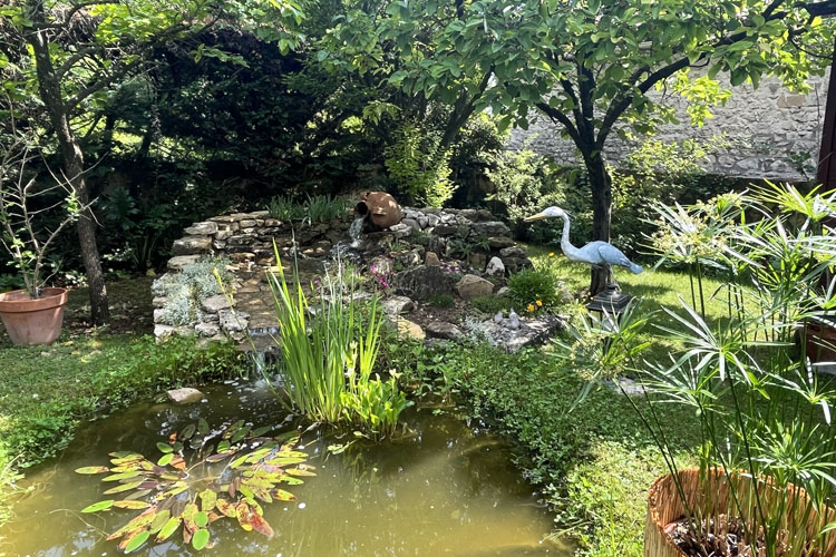 Le jardin comporte plusieurs espaces : une zone ombragée à l’entrée, un coin de cactées et succulentes en pots coté maison, un potager, un bassin et un espace plus « romantique ». Nous avons pu nous balader avec plaisir dans ce jardin en prenant garde, tout de même, à ne pas marcher sur les tortues !