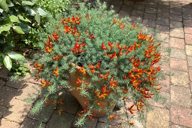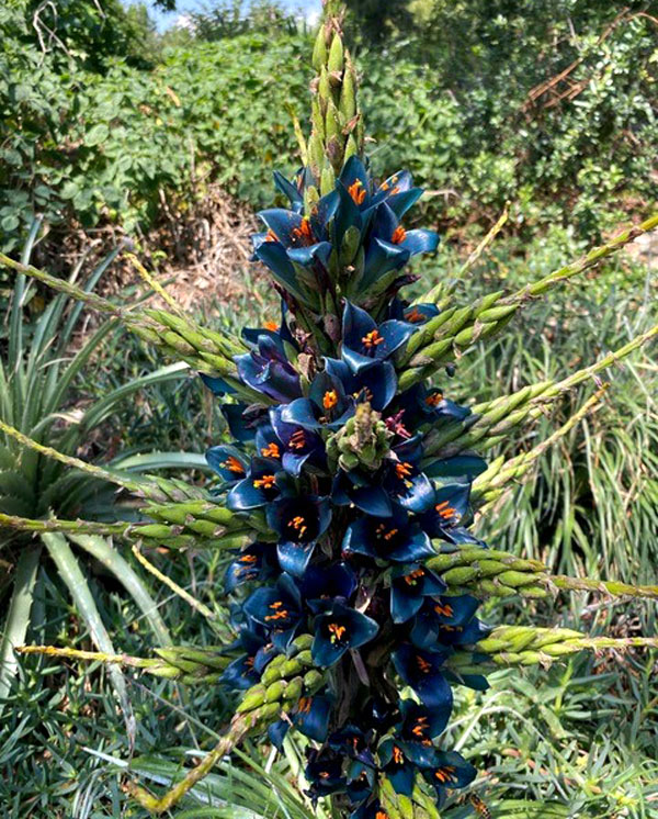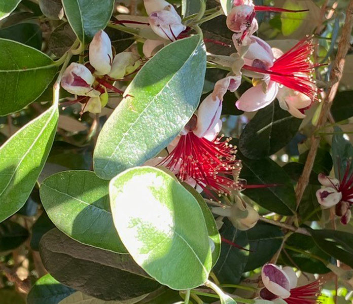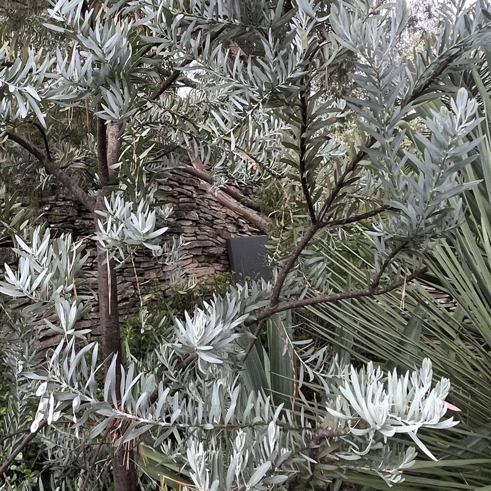 Dans le jardin australien, des chemins sinueux mènent à travers de jeunes forêts d’eucalyptus et d’acacias, dont la taille est déjà impressionnante après seulement quelques années. Une haie de callistemon est couverte de fleurs écarlates. Dans la zone sud-américaine, les vedettes sont un beau Feijoa sellowiana avec ses feuilles brillantes et ses fleurs roses et rouges froufroutantes, et un merveilleux Puya berteroniana, dont les fleurs sont d’une extraordinaire nuance de bleu métallique.