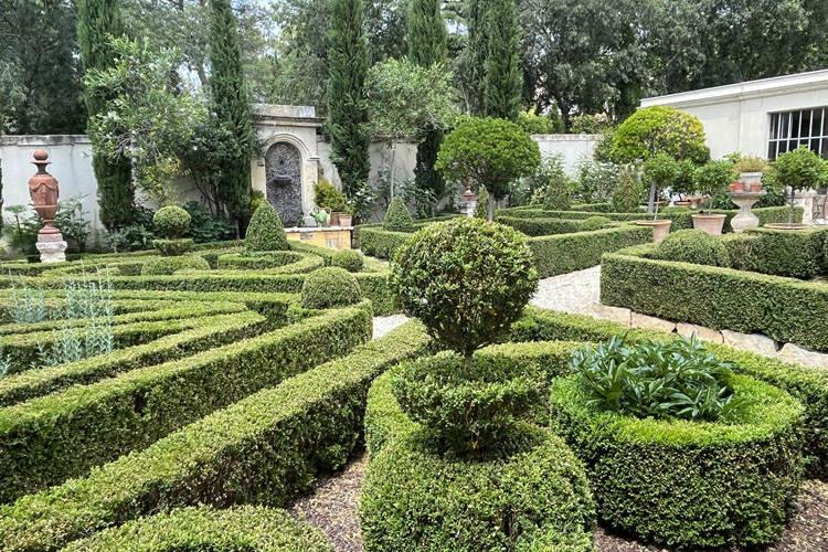 Our second day, 1 June, began with a visit to the botanical garden at Château Pérouse, in the commune of Saint-Gilles. Several botanists guided guests in small groups. We strolled along 130 metres of artificial watercourse below the mature pines and cedars near the château. Water tumbles across a rocky bed, with plants skillfully chosen to give a serene Japanese atmosphere, including a red-leaved maple with twisted branches and cloud-pruned shrubs. Two bridges cross the stream, while waterfalls and rapids fill the air with the sound of bubbling water.