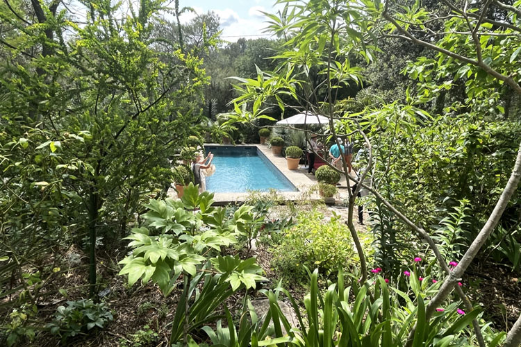 The sun-drenched garden is divided into several different spaces; an Italian garden, the cacti terraces, the swimming pool area with numerous citrus trees in pots and a part where exotic plants and ‘garrigue” were mixed together.