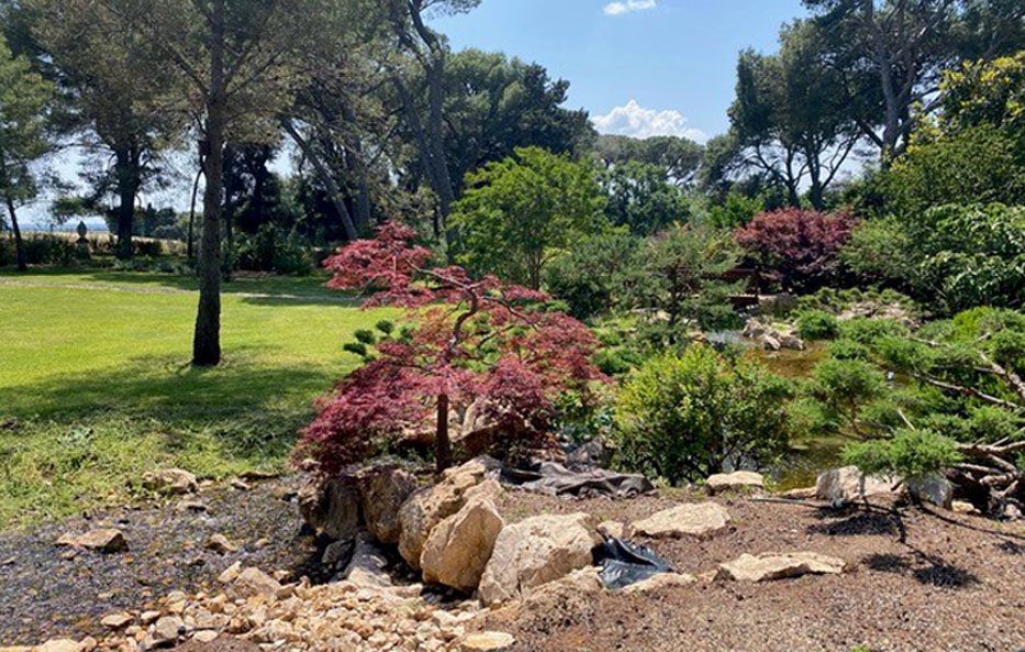 Le 1er juin, notre seconde journée, commence par la visite du jardin botanique du Château Pérouse, situé sur la commune de Saint-Gilles. Plusieurs botanistes du château guident les invités par petits groupes qui déambulent le long d’un cours d’eau artificiel de 130 m de long construit sous les grands pins et cèdres près du château. L’eau s’écoule dans un lit rocheux où des plantes ont été habilement choisies afin de donner une atmosphère japonaise sereine (un érable à feuilles rouges aux branches tordues, des arbustes taillés en nuage). Deux ponts enjambent le cours d’eau, tandis que les chutes d’eau et les rapides emplissent l’air du bruit de l’eau bouillonnante.