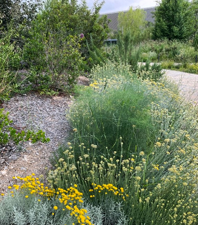 In the Australian garden, winding paths lead through young forests of eucalyptus and acacia, already of impressive size after only a few years. A hedge of callistemon is covered with scarlet bottlebrush flowers. In the South American zone, the stars of the show are a beautiful Feijoa sellowiana with its shiny leaves and frilly pink and red flowers, and a marvelous Puya berteroniana, whose flowers are an extraordinary shade of metallic blue.