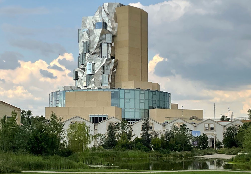 Au cœur du Parc s’élève La Tour imaginée par l’architecte Frank Gehry inaugurée en 2021 qui se compose de différents espaces à usages multiples : salles d’exposition, espaces de travail, de recherche. A première vue cette tour moderne peut surprendre avec sa base circulaire évocatrice des arènes et la façade torsadée ornée de briques en acier inoxydable évoquant les rochers des Alpilles. Mais quand on prend le temps de regarder ses variations lumineuses qui reflètent celles du ciel, on ne peut être que captivé. C’était en particulier le cas le jour de notre visite avec un ciel chargé de magnifiques nuages.