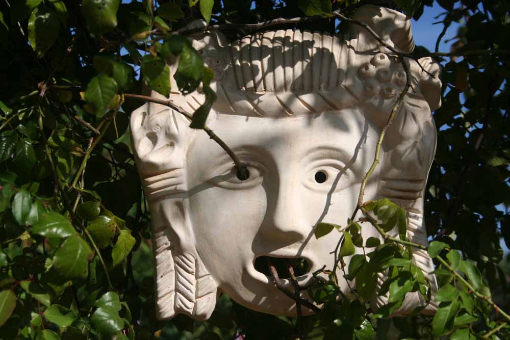 At every step Laurent explains the linkages which were once so obvious to ancient Romans and Greeks, and now so sadly lacking from our own insight into the meaning of gardens. We are the poorer for not having that rich background tapestry of myth, lore, religion and tradition that imbued every aspect of daily life in ancient times. While the skull is pretty much self-explanatory, though possibly not a feature of real Roman gardens, there are strange white ceramic masks hanging from the shrubberies here and there; these are replica oscilla – in this case representing theatrical tragedy. Sad-faced and open-mouthed, they remind the visitor that fate is ever-present, even in a delight-filled garden such as this. The Romans knew that the gods, however self-centred and disdainful of Man, cast their careless whims on all below them.
