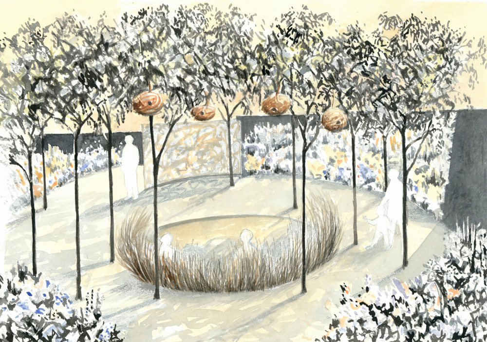 Les zones plantées sont inspirées par quatre fleuves mythiques dans lesquels coulent le lait, le miel, le vin et l’eau. L’usage de matériaux recyclés pointe subtilement les difficultés écologiques auxquelles nous sommes aujourd’hui confrontés. Il s’agit de créer un lieu de paix tout en abordant les questions importantes liées aux espaces cultivés et sauvages.