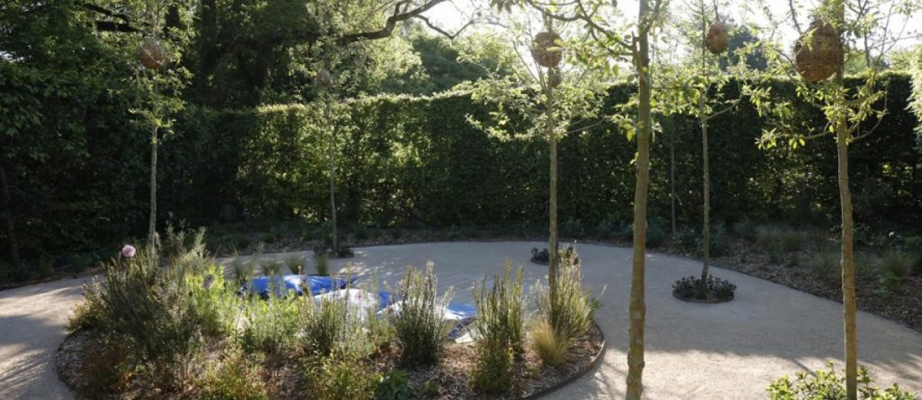 However, when we got the nod, work began in earnest, including the creation of a more detailed set of drawings, sourcing a sound consultant who assisted with technicalities such as advising on the amplifiers and loudspeakers which were to be housed in the surrounding hedging, and sourcing a willow worker, Blaise Cayol, who works from Tavel in the Gard for the screen and the nests which were to be hung in the 14 crab apple trees, Malus ‘Evereste’. Plants were to be sourced via the Domaine de Chaumont-sur-Loire and were mostly of good quality but a few, less so. The main contractor was local and efficient – thank you Julien Bourdin. We made three visits of about four days each during the build with final planting taking place in the second week of April. A frost followed us across the Loire…