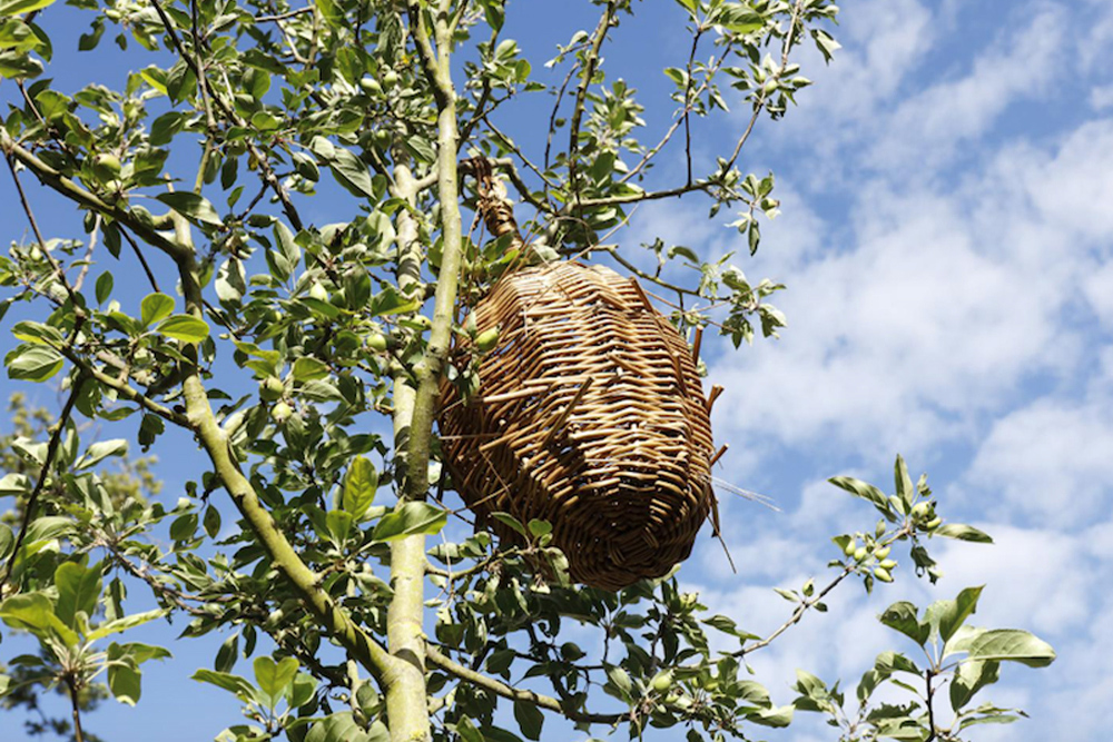 Derrière un épais rideau végétal, se dévoile un verger dans la fraîcheur duquel il fait bon se reposer, allongé sur des coussins, regardant le ciel à travers les feuillages et observant dans les branches les nids d’oiseaux exotiques. Au sol, un écrin d’osier protecteur fait écho à ces abris douillets. La magie opère pour les enfants comme pour les adultes.