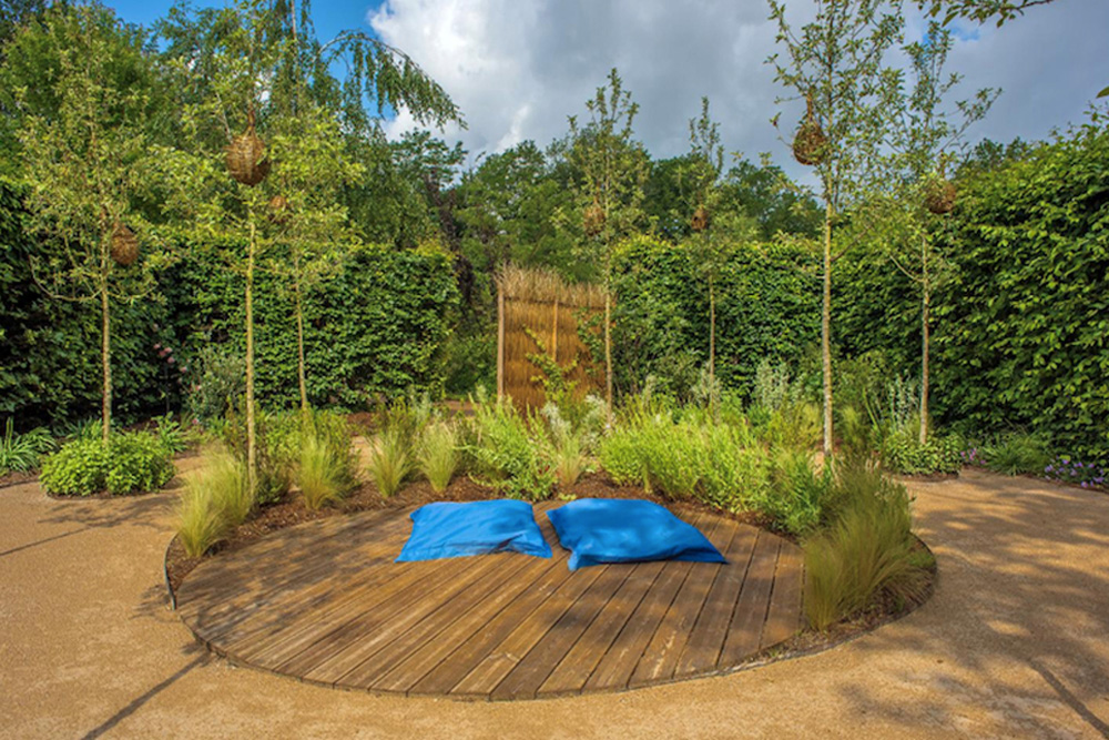 Behind a willow screen lies an orchard providing refreshing cool air and a pleasant place to rest, lying on cushions, looking up at the sky through the foliage and observing the nests of exotic birds in the branches. On the ground, the protective wicker sanctuary echoes these cosy shelters. Young and old alike will be struck by the magic.