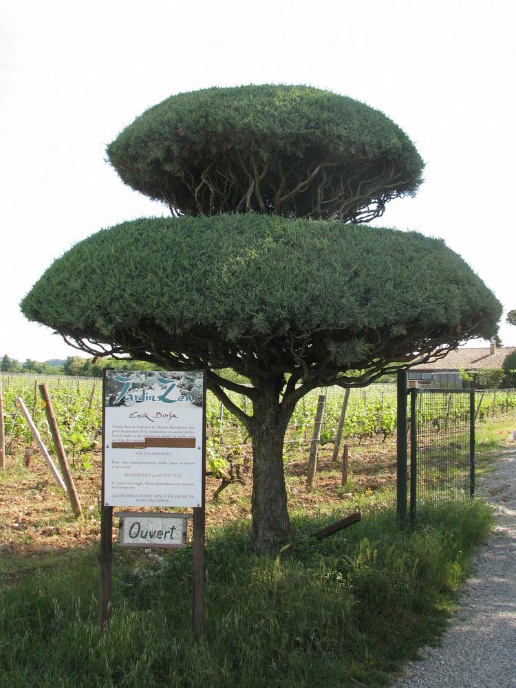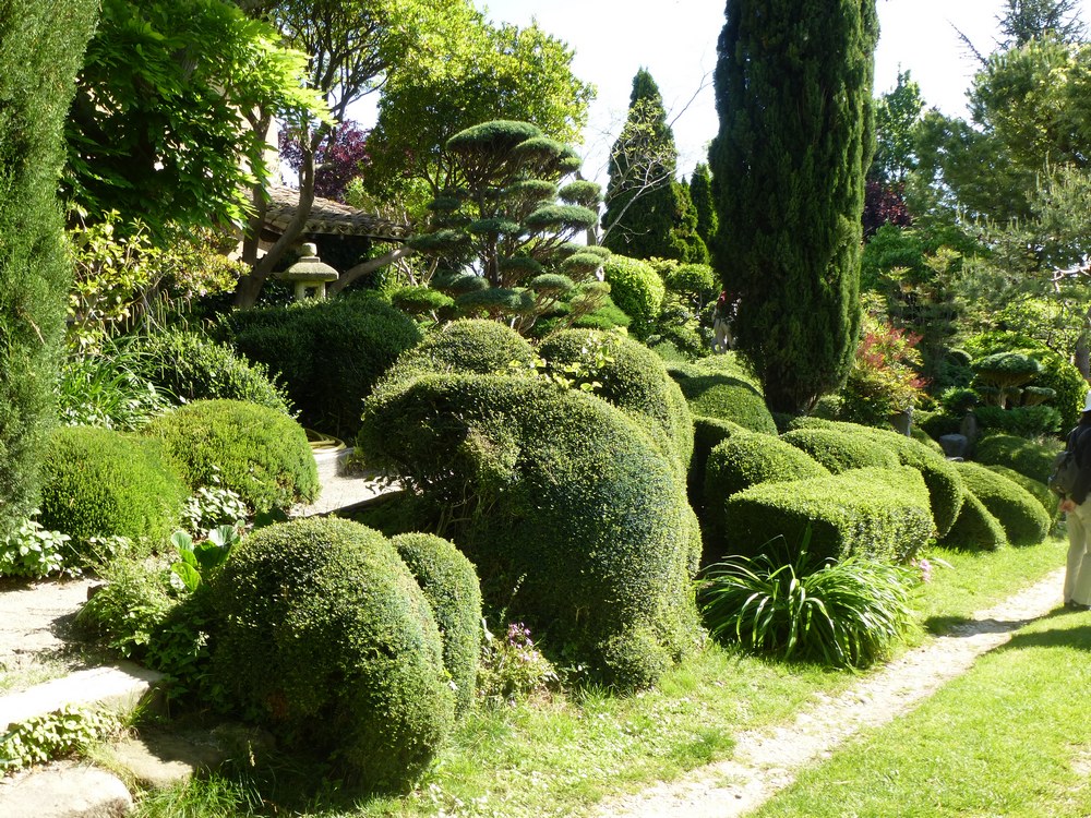 La grande caractéristique de ce lieu est la taille en nuages ou en boules des végétaux en très grand nombre : cyprès, érables du Japon, buis, myrtes, lonicera nitida, raphiolepis, lauriers tin, cornus, arbousiers, éléagnus, loropetalum, lonicera tatarica, érables etc…, mais aussi par la grande palette de couleurs des feuillages.