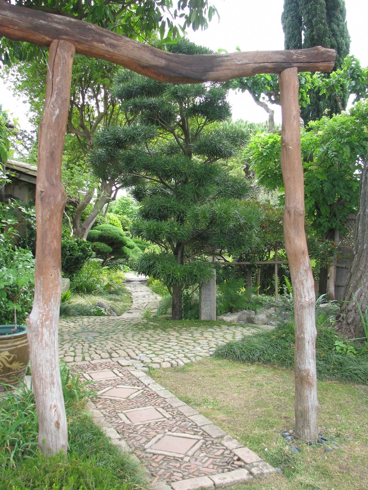 6. A l’est, le jardin du Dragon, encore plus bas, avec un étang et deux cascades. A flanc de coteau on découvre une petite maison de thé. Au nord un Tori (portique Shinto) est consacré à l’esprit de la rivière.