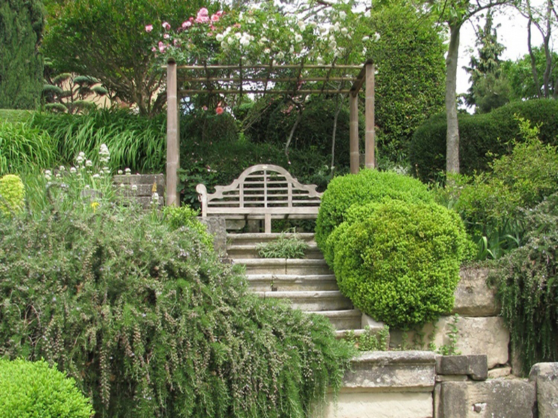 Jardin très bien entretenu, très vert, où l’eau est présente partout.