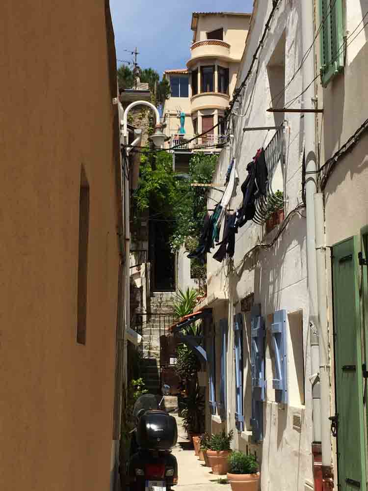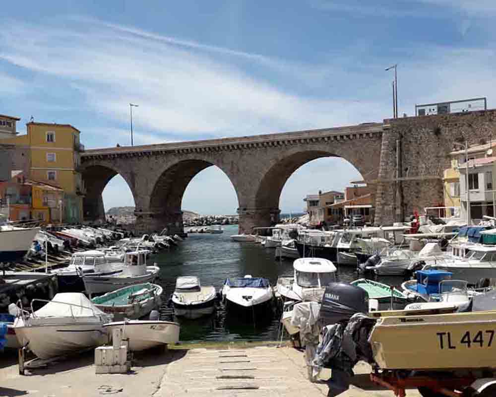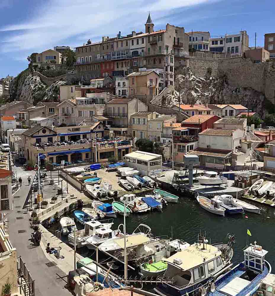 The Vallon des Auffes is a small traditional fishing village situated in an inlet right in the heart of Marseilles, just 2.5 km south-west of the Vieux-Port. The Corniche Kennedy goes overhead on a viaduct, while out to sea, the outlines of the Îles de Frioul can be seen. The Vallon shelters some fifty fishermen’s cabins and small fishing boats and gets its name from a grass used in making rope and fishing nets: l’auffe (Stipa tenacissima). Precipitous rocks overlook the tiny port with houses clinging to the cliffs and perching on the top.