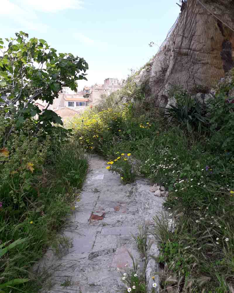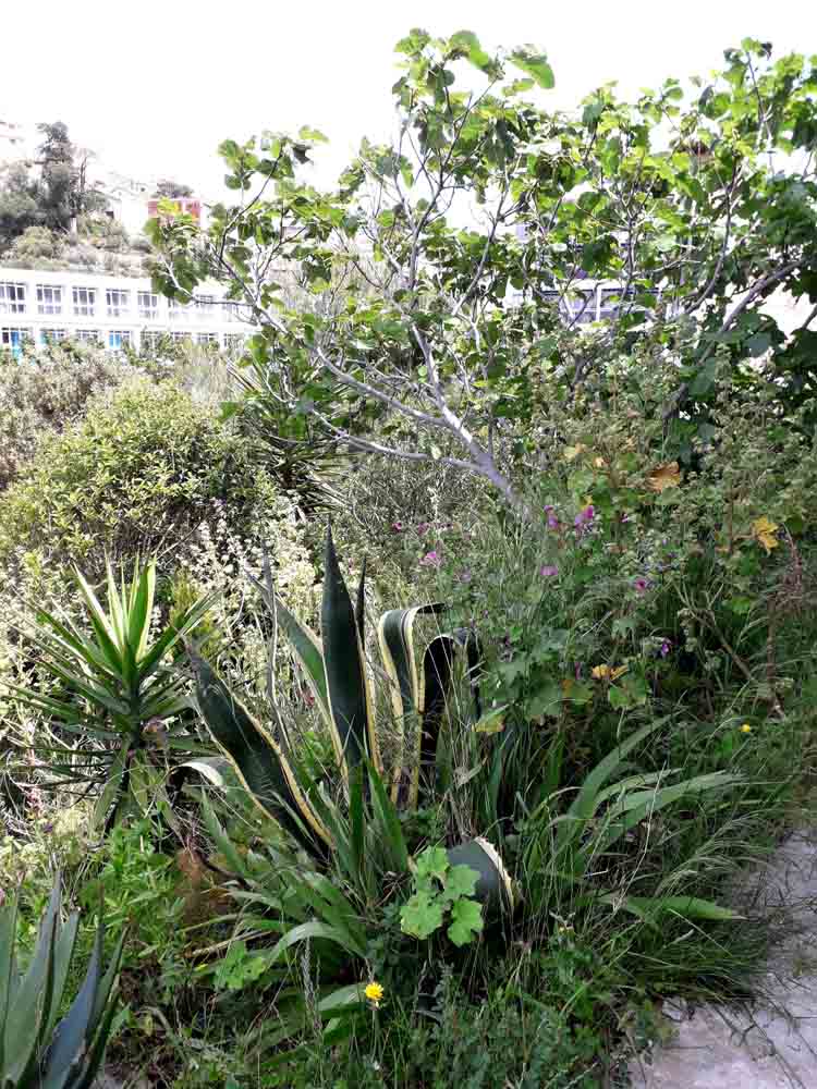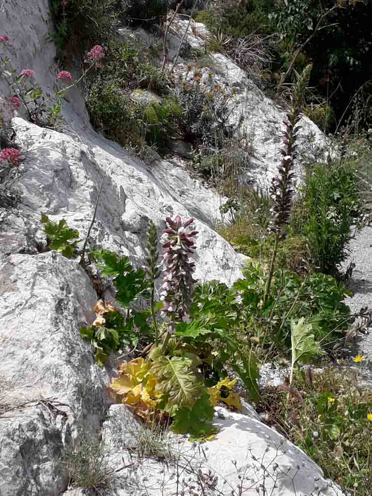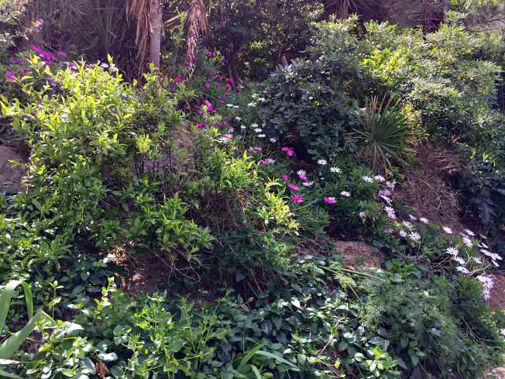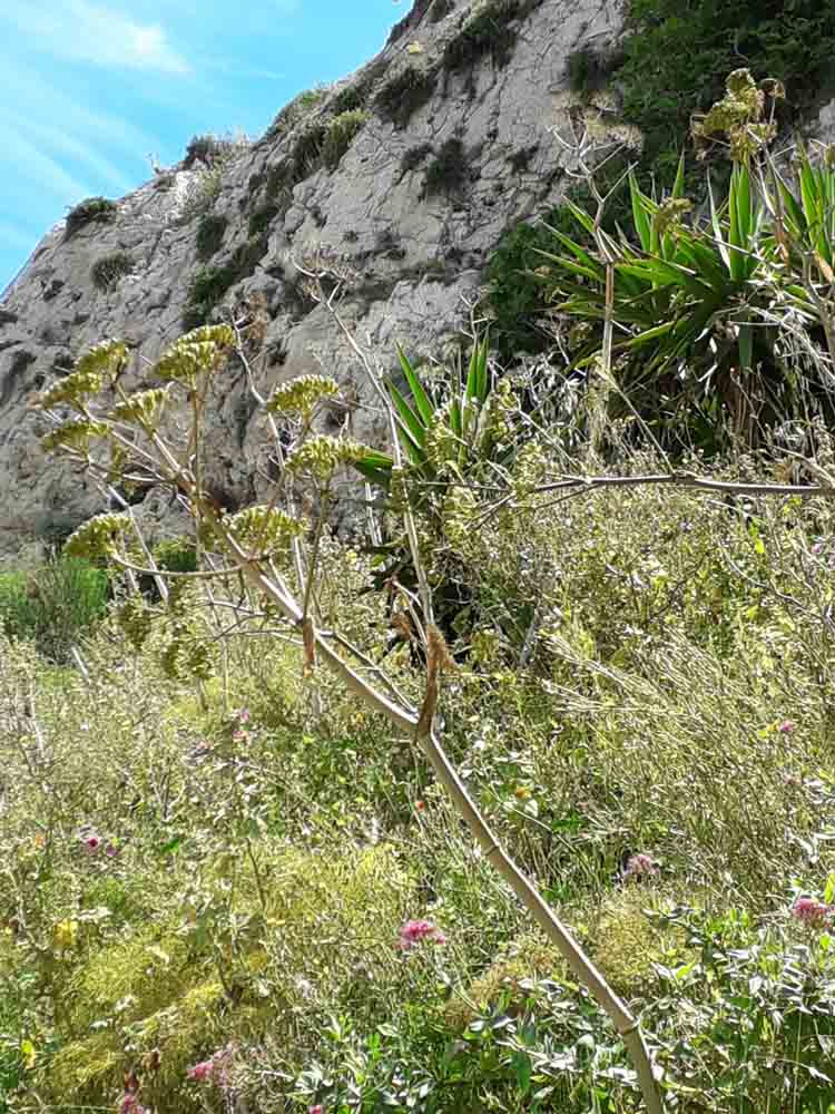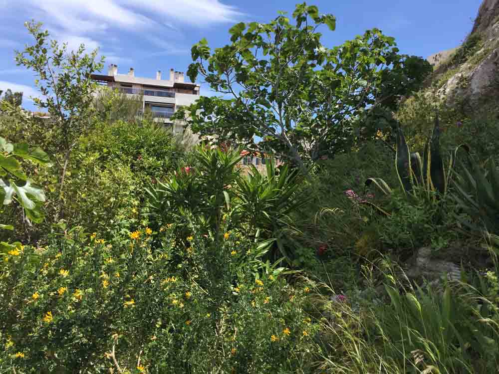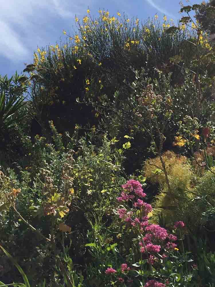 Au pied de la falaise, la végétation, ombragée, est verte et luxuriante : osteospermums roses et blancs, omniprésence de la valériane rouge, Coronilla valentina et genêts odorants (Spartium junceum). Au niveau intermédiaire, la végétation est encore dense : figuiers, oliviers et arbustes de toutes sortes surplombent les chemins étroits. Les agaves, les cordylines et les mauves arborescentes (Malva arborea) s’entassent dans l’espace restreint, tandis que les chemins sont bordés d’Erigeron karvinskianus et d’autres plantes auto-ensemencées. Et au sommet, là où les chemins ne vont pas, en plein soleil, se trouvent les vrais survivants : le fenouil géant (Ferula communis), l’acanthe à feuilles molles (Acanthus mollis), la valériane rose et rouge et toutes sortes de plantes sauvages qui se sont invitées.