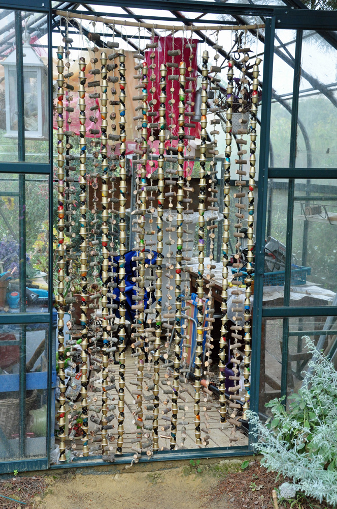 Unfortunately, bees, butterflies and other insects are often trapped in greenhouses. An anti-insect curtain will prevent them from entering. Empty aluminium coffee capsules can be recycled to make an anti-insect curtain. For a 2m x 1m curtain, if you alternate capsules and pieces of wood, you will need 650 capsules. If you only use capsules, you’ll need 1300. You have to pierce the capsules at the base to pass the string through.