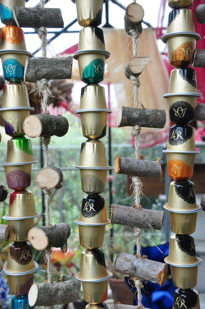 Curtain made of capsules and wood / Rideau de capsules et de morceaux de bois