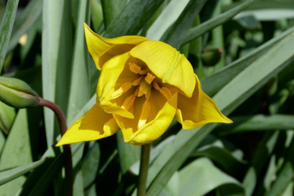 The front garden beds are about 10 years old and shaded by two large Canary Island date palms (Phoenix canariensis) which are being treated to save them from disease; the third palm has already succumbed to the beetle. A mix of tulips, Spanish bluebells, and Narcissus ‘Tete a Tete’, were in flower.