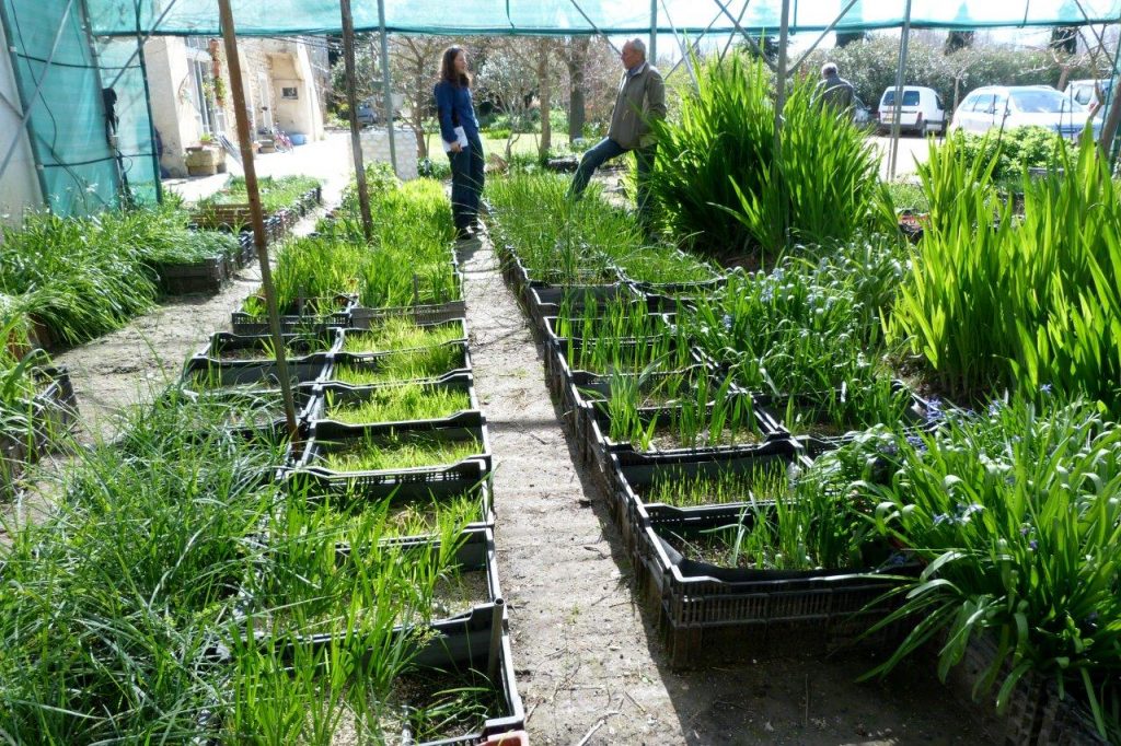 In the main growing areas, bulbs are grown in long beds of raised earth, rather than in constructed raised beds, and are interspersed with a few olive trees and Melia azedarach. The bulbs are protected from the wind by oleander, cypress and Euonymous japonicus and mulched with local rice straw from the Camargue, mainly to prevent soil compaction from the rain. Bulbs growing here include: Iris unguicularis, Tulipa clusiana and T. sylvestris, as well as alliums, crocuses and fritillaries.