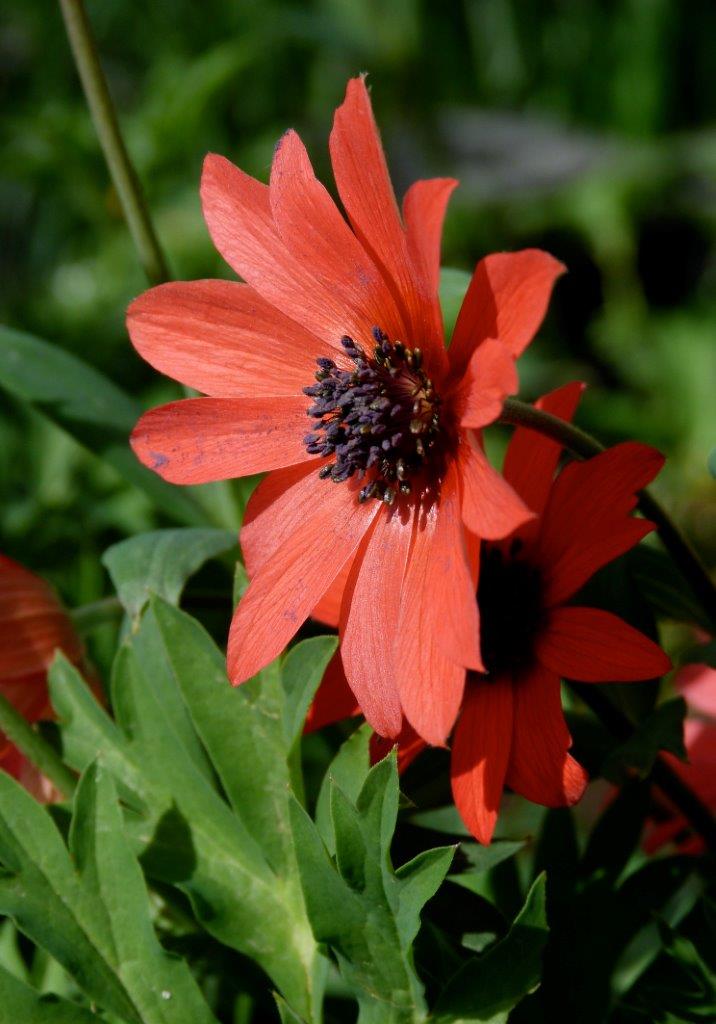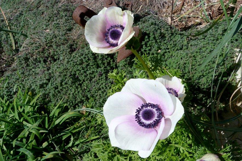 You can walk up and round the tiny paths of the rock garden which is a test bed of different plants to see what survives without watering. This is heavily mulched every year with shreddings and includes ground cover plants. In flower were Anenome coronaria and several narcissus species.