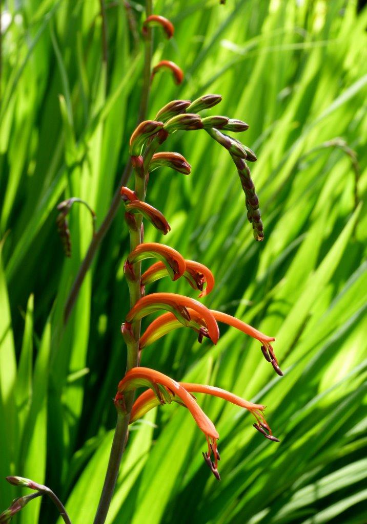 The shade tunnel houses the nursery’s most special bulbs including those from South Africa and South America. These include the bright red Anemone fulgens, Hesperantha cucullata, Hyacinthus orientalis, the large yellow Lachenalia aloides ‘Ronina’, the fragrant Muscari macrocarpum, Oxalis palmifrons and O. obtusa, the climber Tropaeolum tricolor, as well as dracunculus, freesia, moraea and ornithogalum. Growing in the ground was a huge clump of Chasmanthe bicolor. Next to the shade tunnel were rows of different narcissi.