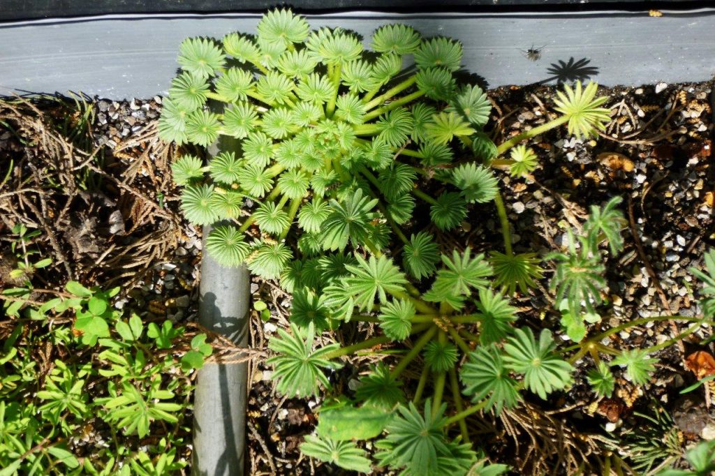 The ‘lawn’ in the back garden consists of the ground covering plants, Dichondra repens, Achillea crithmifolia and Phyla (formerly Lippia) nodiflora. The level of the lawn is raised by a line of breeze blocks planted with bulbs to test how they grow in container conditions.