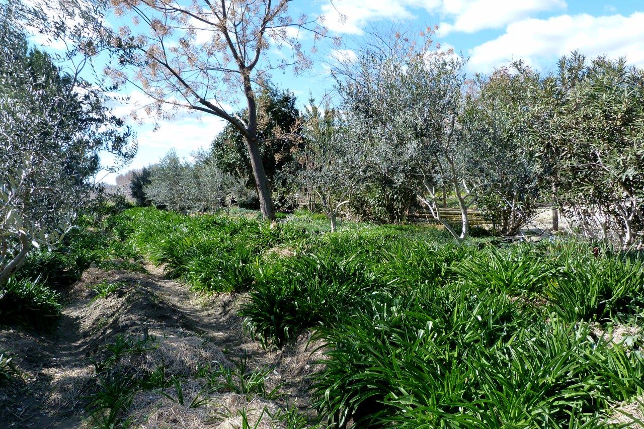 In the main growing areas, bulbs are grown in long beds of raised earth, rather than in constructed raised beds, and are interspersed with a few olive trees and Melia azedarach. The bulbs are protected from the wind by oleander, cypress and Euonymous japonicus and mulched with local rice straw from the Camargue, mainly to prevent soil compaction from the rain. Bulbs growing here include: Iris unguicularis, Tulipa clusiana and T. sylvestris, as well as alliums, crocuses and fritillaries.