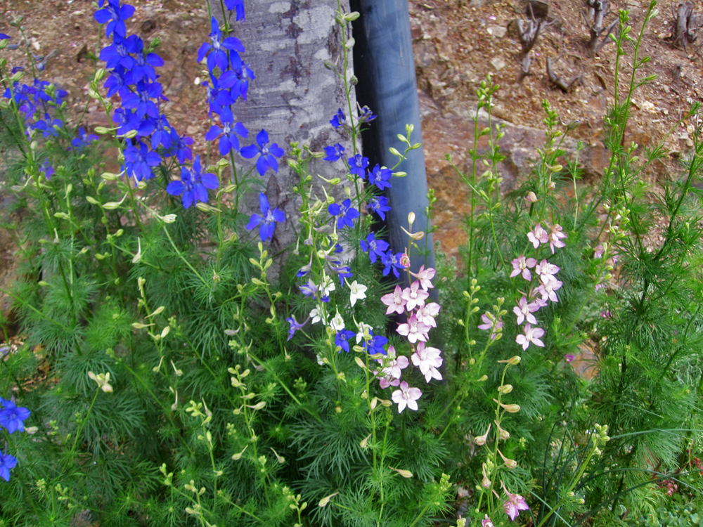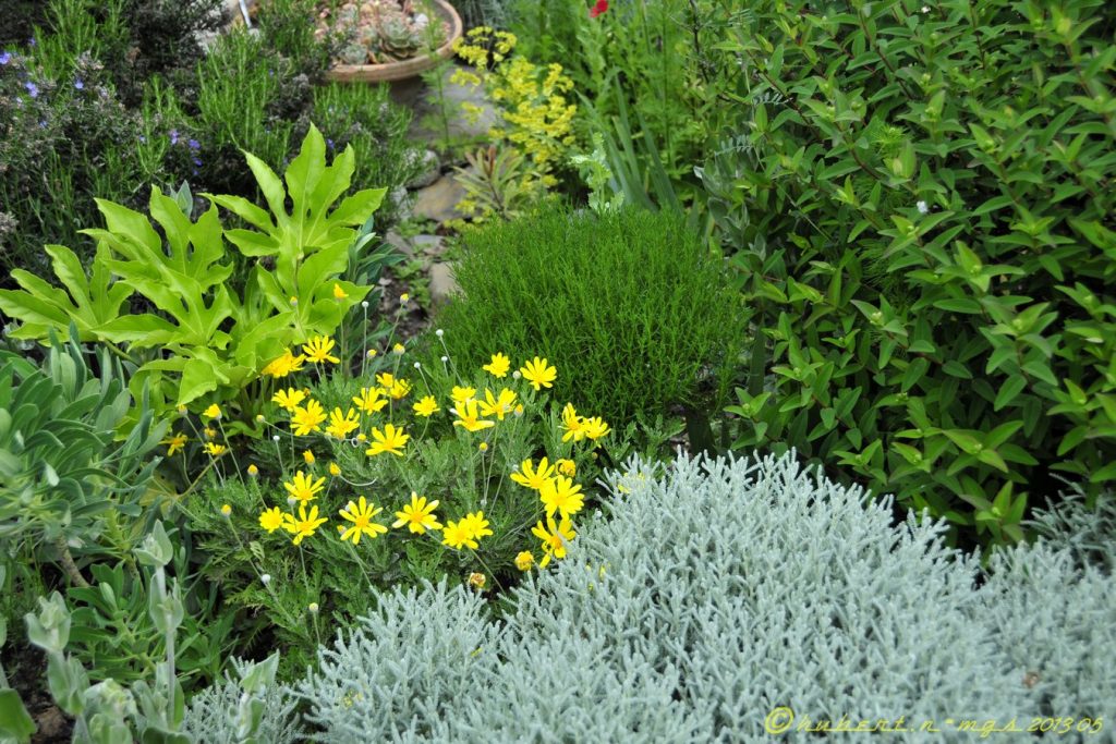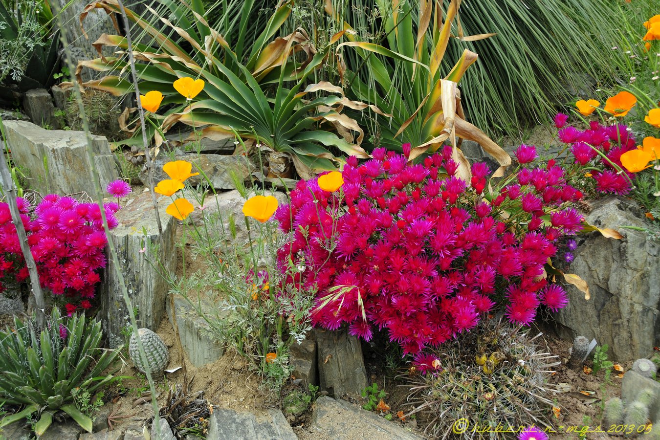 There are lots of grey leaved plants giving a soft background, interesting shapes from the cacti and palms, a splendid Phoenix canariensis with enough space around to show off, poppies, aquilegia, and larkspur giving colour in any space available, something different round each bend, each plant looking as if this was just where it should be.