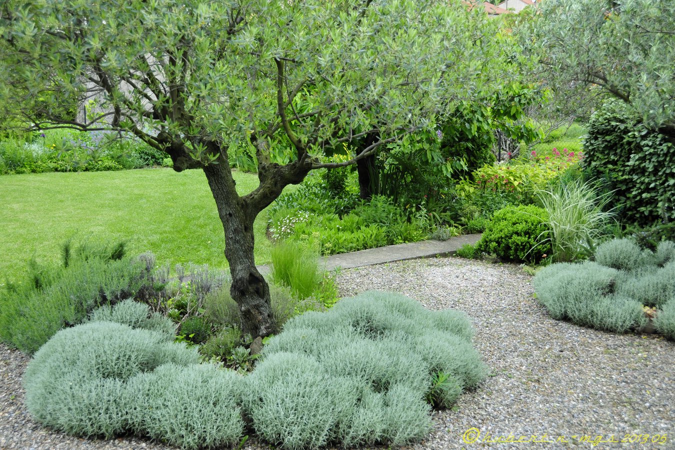 Much knowledge and care has gone into the planting and managing. I can imagine sitting on the terrace enjoying a pleasing variety of views: shapely santolinas bordering a gravel path in front of olive trees as a reminder of the outer world, the charming effect of the pool with an attractive variegated low shrub edging, then, beyond the herbaceous border, the promise of good eating from the riches of the well managed potager.
