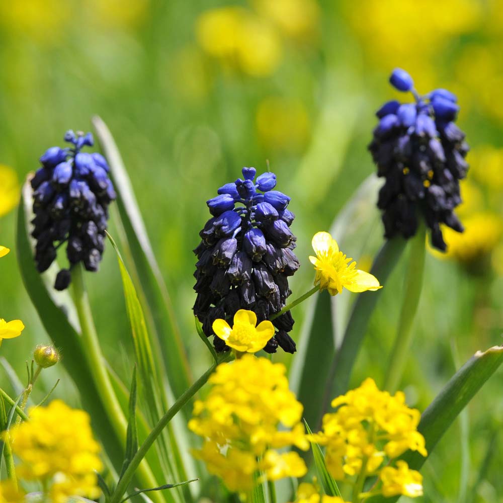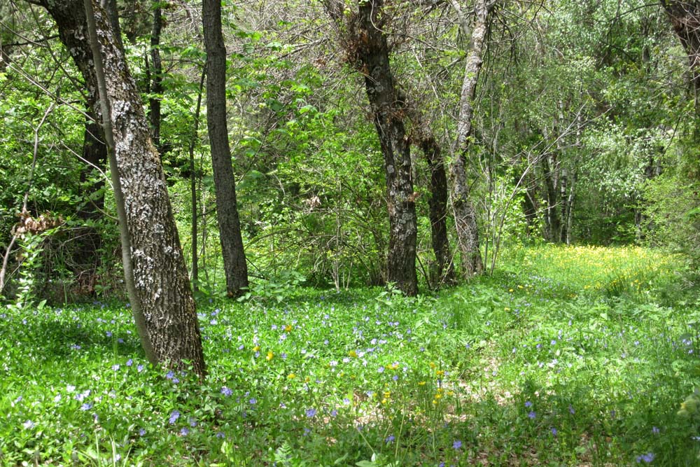 Above the wooded area the grasslands were covered in blue and yellow flowers.