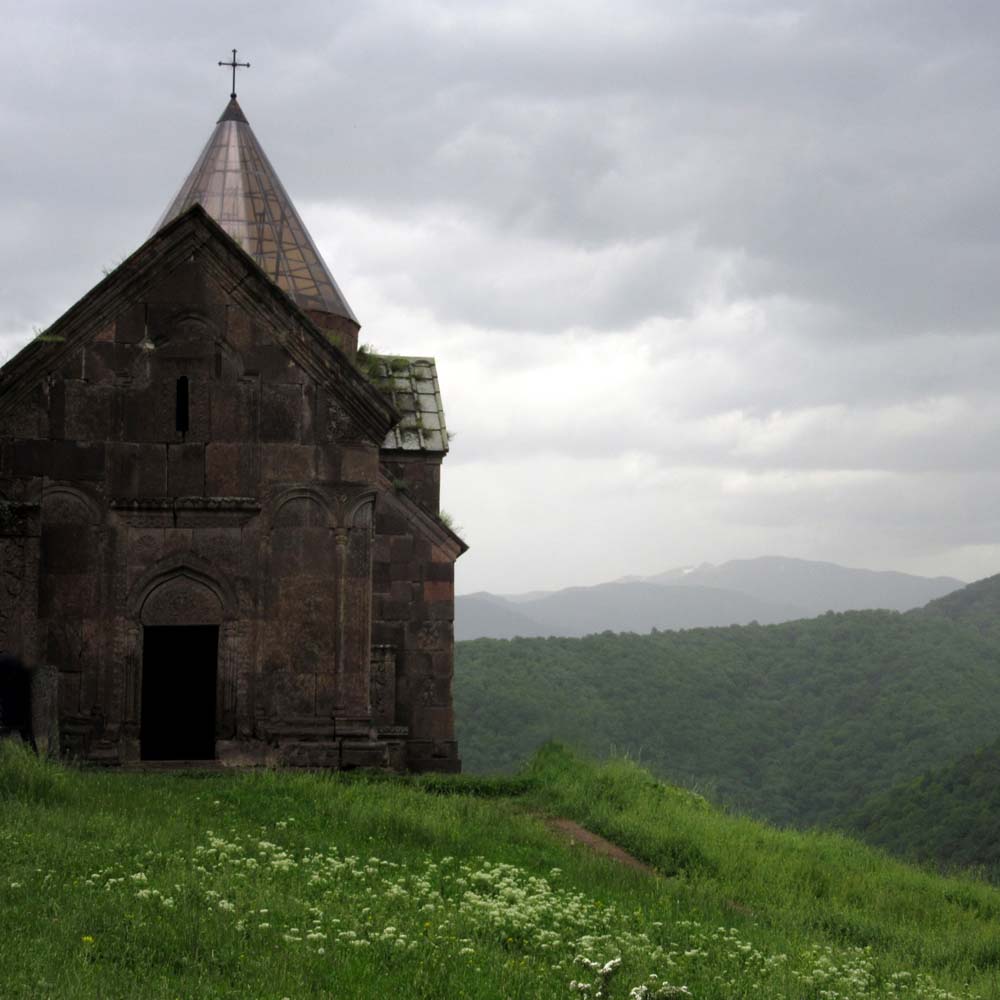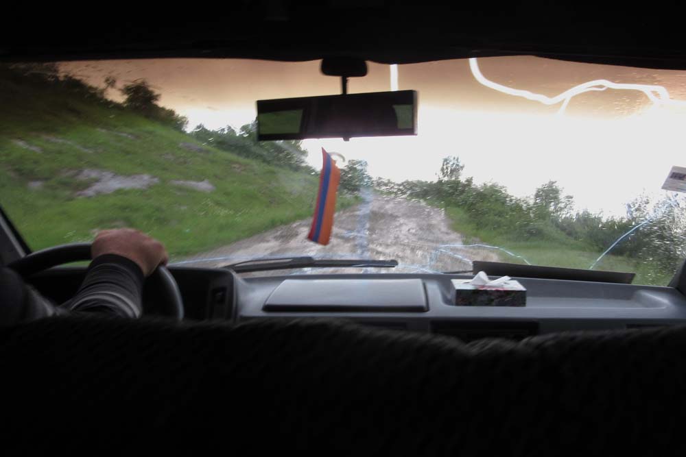 L’après-midi, route vers le monastère de Makaravank d’abord en bus, puis en minibus sur une mauvaise piste, sous une violente pluie d’orage. Au retour de la visite du monastère, deux arrêts au bord de la piste pour faire des photos de l’Azerbaïdjan tout proche. Au 2ème arrêt, rapide exploration de la prairie.