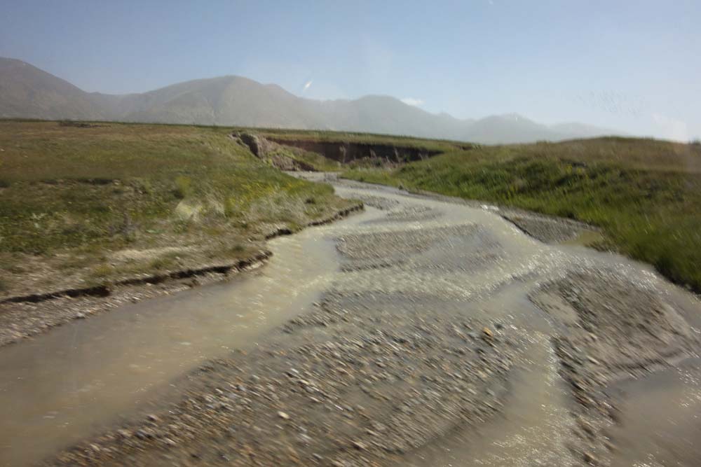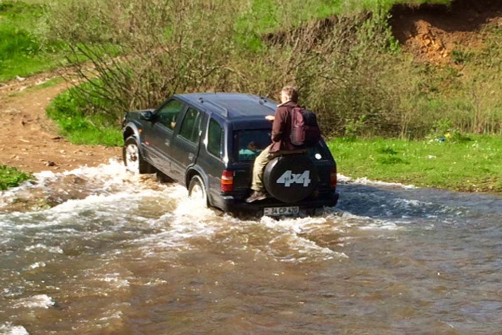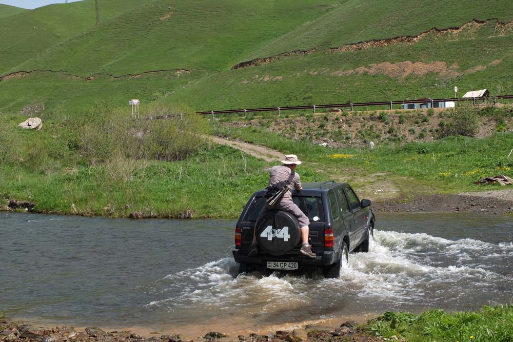 Dilijan is in thickly forested country and when we left the area on Friday we entered a tunnel on a mountain pass and on the other side found no trees, but a line of green hills. We pulled up to see some hillside flowers, but there was a river in the way. No problem, a four wheel drive vehicle appeared and ferried people across, four at a time.