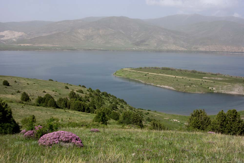 Après le pique-nique dans le jardin, départ pour la Péninsule d’Artanish, au bord du Lac Sevan. Avant d’arriver à la péninsule, sur les bas-côtés de la route, nombreux Iris paradoxa. Les pentes sont couvertes par des coussins rose foncé d‘Onobrychis cornuta.