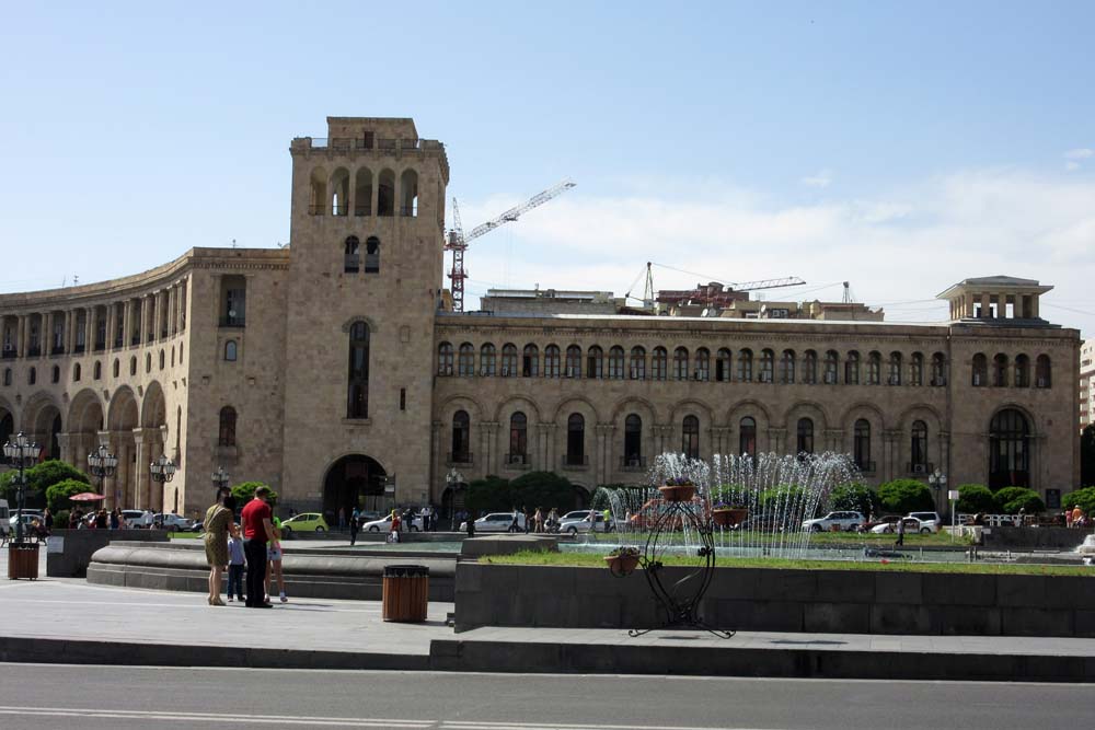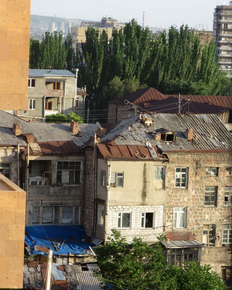 Yerevan is such a mixture of the spanking new, of dilapidated houses with wooden balconies and of the metal and concrete detritus of Soviet times. The road into the city is a jumble of nightclubs and casinos, of snack shops, of Mercedes showrooms and then one feels the full weight of Soviet imperialism in the grand stone buildings of Republic Square.