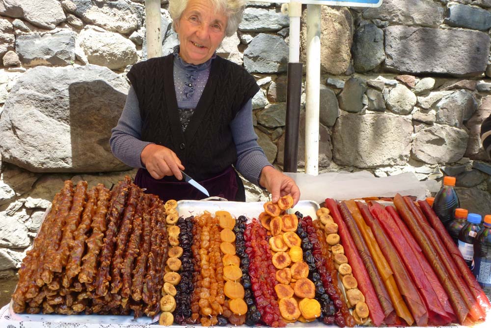 There, as we were to see frequently, sat the merchants of large cakes, of home-made vodka and of apricot leather (known locally as ‘fruit bread’ since it has the same flat form as the main type of bread in the country, ‘lavash’).