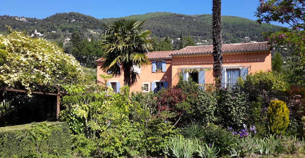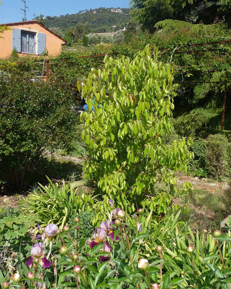 Le Mas des Pivoines is a lovely garden, which as Marcel and Lucile Barrault’s website rightly says, has all the charm of an old Grasse country garden with its arbours and its calade, a garden in constant evolution. 15,000 square metres in all, it has a substantial flat area around the house, then a steep descent down a few restanques to a field bordering a stream (dry in summer). They moved here 17 years ago, bringing seven lorry loads of plants – although, alas, unused to frost in their previous Grasse garden, they lost a huge number of them (six of the seven lorry loads, according to M. Barrault!) after the temperature dropped to – 8°C.