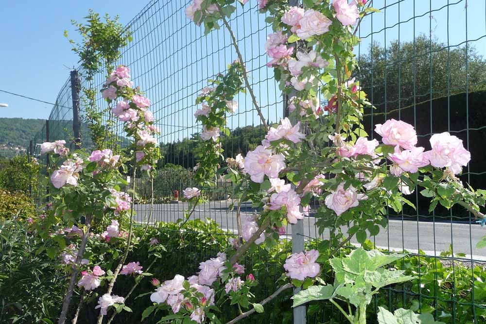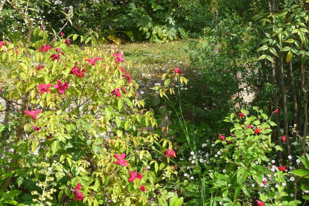 Among the many roses are Rosa ‘Excelsa’, R. ‘Clair Matin’, R. ‘Lady Waterlow’, R. ‘Etoile de Hollande’, R. ‘Arielle Dombasle’ and R. ‘Voile de la Mariée’, a number of which flower several times a year. Rosa ‘Lady Waterlow’, 1909, by M Nabonnand, a great rose grower of the ‘Midi’ is a little known rose according to Mme Barrault.
