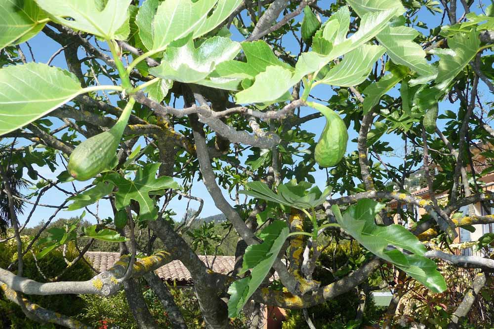 Among many small trees are an unusual fig tree with elongated fruits,