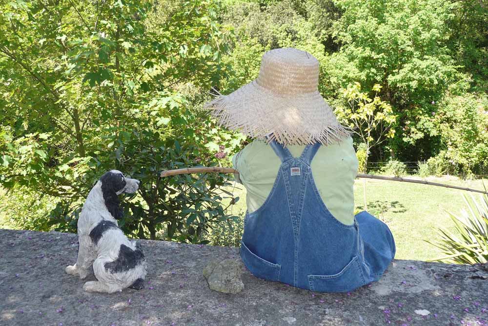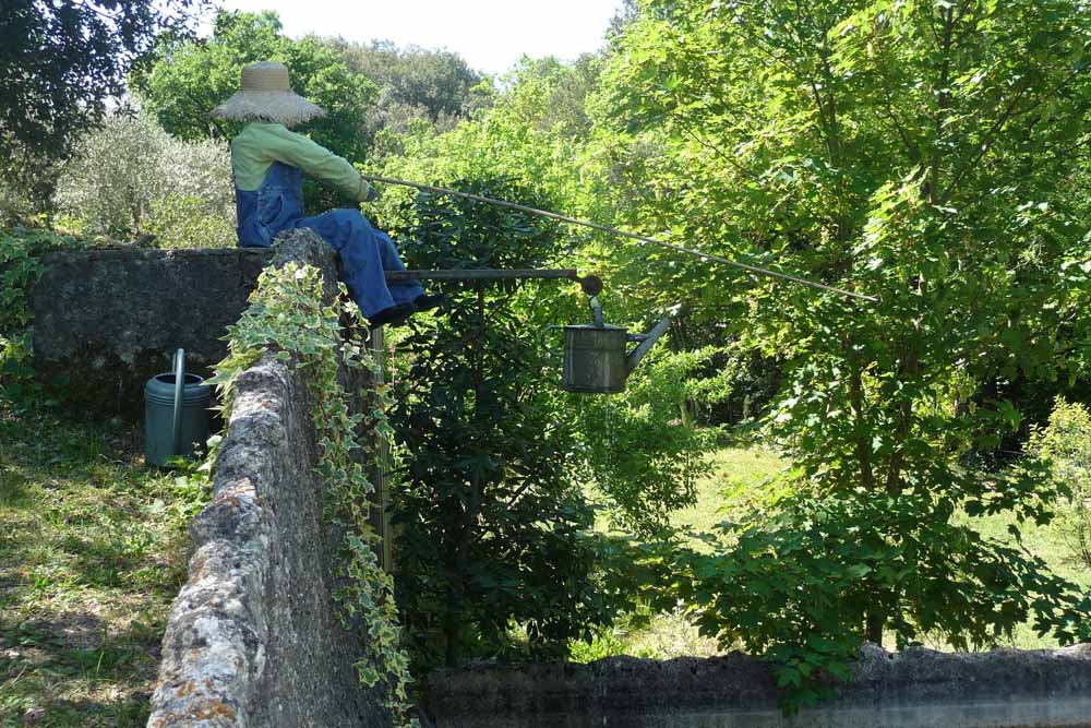 The garden has a sense of humour too. An amusing feature, encountered as we went down the steep steps, was a peaceful figure of a man and his spaniel, calmly fishing from the bassin and a Heath Robinson arrangement for drawing up water in an old watering can: on closer inspection, both man and dog were straw and clay models!